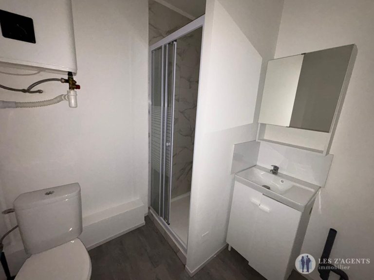 La salle d’eau est équipée de sa douche et d’un lavabo avec petit rangement